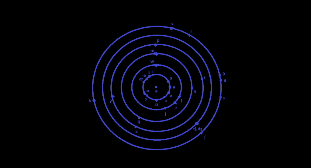 The grammatology of English sounds can be mapped into a solar form according to the following: six concentric rings map out to six radii representing the classifications of sounds. R=0 maps to silence and empty opening (void), r=1 represents vowels, r=2 approximants, r=3 nasals, r=4 stops, r=5 affricates and r=6 fricatives. This represents the solarization of the mouth’s openings; a common base ground is repeated through the process of individuation as different gradients of closure are bifurcated. The second repetition is one of the angle of the circle radii, as the angle represents position of the tongue shifting into various forms. It completes the surface of accounting, as sounds are mapped from an angle of 0 degrees, representing the lips, all the way to 360, representing the throat. Each sound of the English language is thus mapped into these two factors of solarization, and writing thus proceeds in a bypass of the crunching optimization of the pseudo solar, leaving ambiguity as a part of experience. Linking the points reveals a sigil into a penetration of thought into the Thing, making grammatology a code of thought-linking rather than separating into the infinite. The Black Sun is precisely the operation of presence and synthesis. A black flame informs system into transformation, and dynamism, making language a web of corresponding synchronicities of reality.